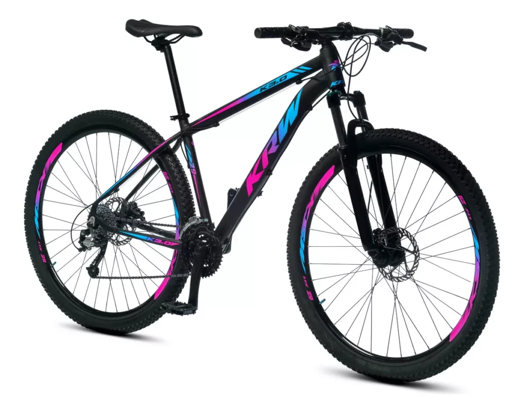 Bicicleta Aro 29 Krw Alumínio 24 Vel Freio A Disco Suspensão Dianteira X42 Cor Preto/Rosa e Azul Tamanho Do Quadro 19